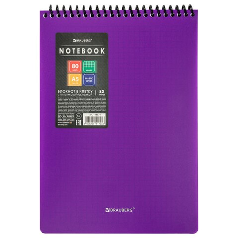 Блокнот А5 80 л., спираль пластиковая, обложка пластик, клетка, BRAUBERG "Metropolis", ФИОЛЕТОВЫЙ, 115571
