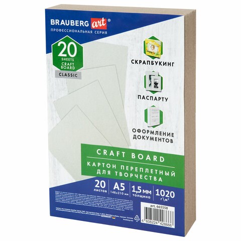 Картон переплетный, толщина 1,5 мм, А5 (148х210 мм), КОМПЛЕКТ 20 шт., BRAUBERG ART, 665558