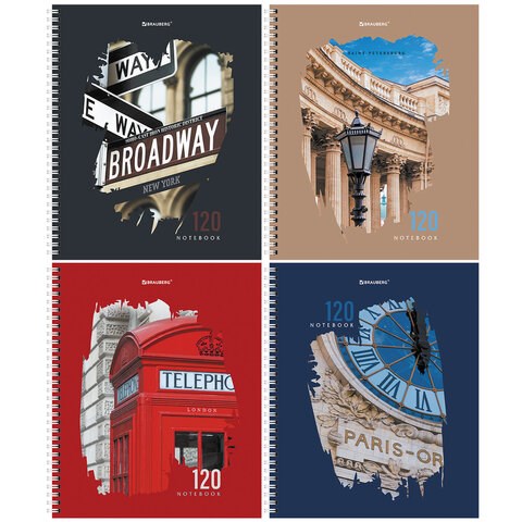 Тетрадь А5 120 л. BRAUBERG, гребень, клетка, твёрдая обложка, "Города" (микс в спайке), 404449
