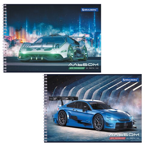 Альбом для рисования А4, 24 листа, гребень, обложка картон, BRAUBERG, 195х285 мм, "Спорткар" (2 вида), 106695