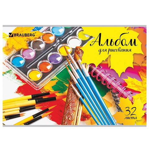 Альбом для рисования А4, 32 листа, скоба, обложка картон, BRAUBERG, 202х285 мм, "Краски" (1 вид), 105063