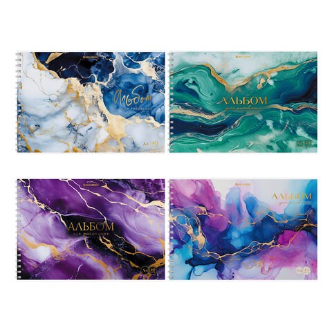 Альбом для рисования А4, 40 л., гребень, обложка картон, BRAUBERG, 195х285 мм, "МРАМОР" (4 вида), 107121