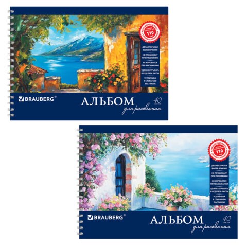 Альбом для рисования, А4, 40 листов, гребень, обложка картон, BRAUBERG, 205х290 мм, "Пейзаж с цветами" (2 вида), 103730