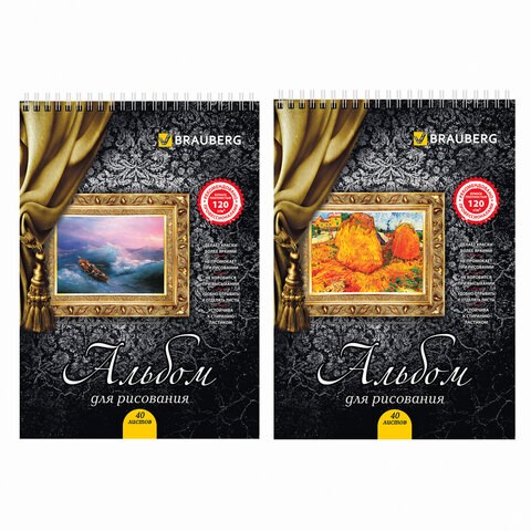 Альбом для рисования, А4, 40 листов, гребень, выборочный лак, подложка, 120 г/м2, BRAUBERG, 205х290 мм, "Картина" (2 вида), 102834