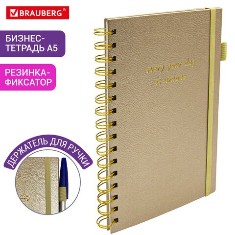Бизнес-тетрадь на гребне А5 148х216мм BRAUBERG Calipso под кожу, резинка, клетка, 80л, бежевый, 116254