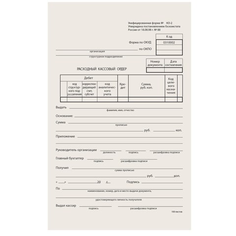 Бланк бухгалтерский типографский "Расходно-кассовый ордер", А5 (134х192 мм), СКЛЕЙКА 100 шт., 130005
