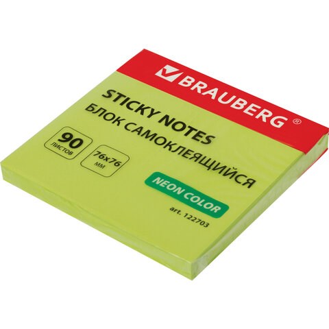 Блок самоклеящийся (стикеры), BRAUBERG, НЕОНОВЫЙ, 76х76 мм, 90 листов, зеленый, 122703