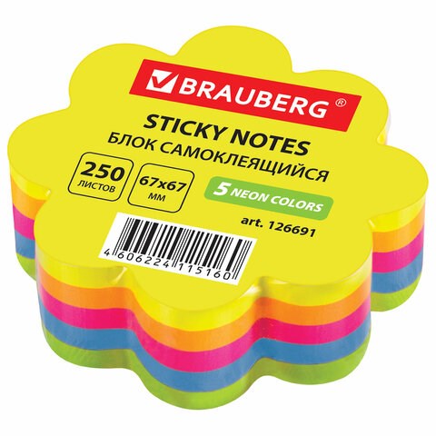 Блок самоклеящийся (стикеры), фигурный, BRAUBERG, НЕОНОВЫЙ "Цветок", 250 листов, 5 цветов, 126691