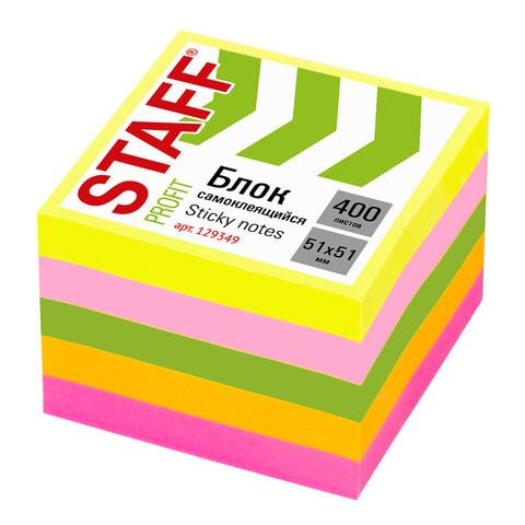 Блок самоклеящийся (стикеры) STAFF, НЕОНОВЫЙ, 51х51 мм, 400 листов, 5 цветов, 129349