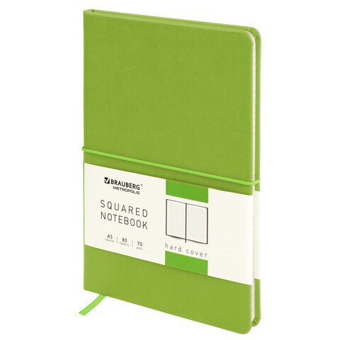 Блокнот А5 148x218 мм, BRAUBERG Metropolis X, под кожу, 80 л., резинка, клетка, светло-зеленый, 111033
