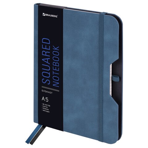 Блокнот А5 (162х218 мм), BRAUBERG "NOTE", под кожу софт-тач, с резинкой, 80 л., клетка, синий, 113438