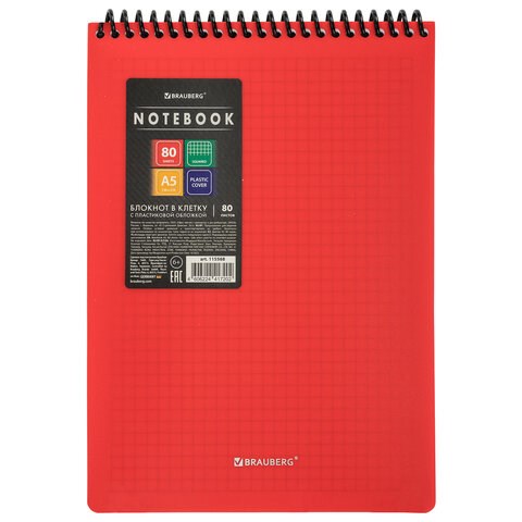 Блокнот А5 80 л., спираль пластиковая, обложка пластик, клетка, BRAUBERG "Metropolis", КРАСНЫЙ, 115568