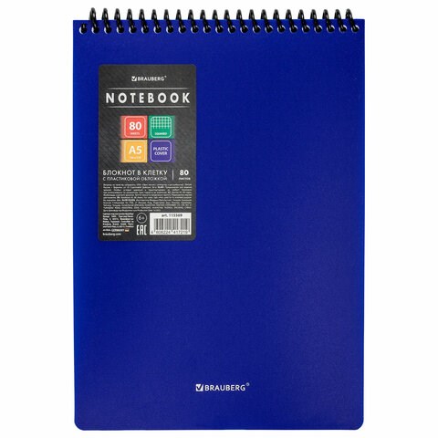 Блокнот А5 80 л., спираль пластиковая, обложка пластик, клетка, BRAUBERG "Metropolis", СИНИЙ, 115569