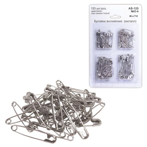 Булавки английские BLITZ, набор 125 шт., размер 0-4, никелированные, блистер, AS-125