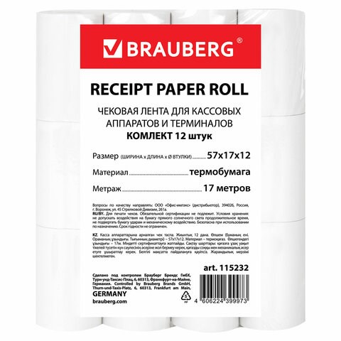 Чековая лента ТЕРМОБУМАГА 57 мм (диаметр 35 мм, длина 17 м, втулка 12 мм) КОМПЛЕКТ 12 шт., BRAUBERG, 115232