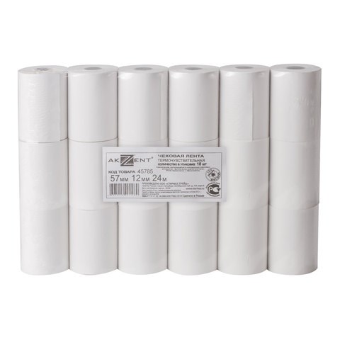 Чековая лента ТЕРМОБУМАГА 57 мм (диаметр 40 мм, длина 24 м, втулка 12 мм) КОМПЛЕКТ 18 шт., AKZENT