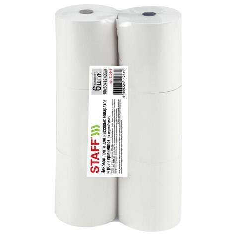 Чековая лента ТЕРМОБУМАГА 80 мм (диаметр 66-73 мм, длина 60 м, втулка 12 мм) КОМПЛЕКТ 6 шт., STAFF, 110449