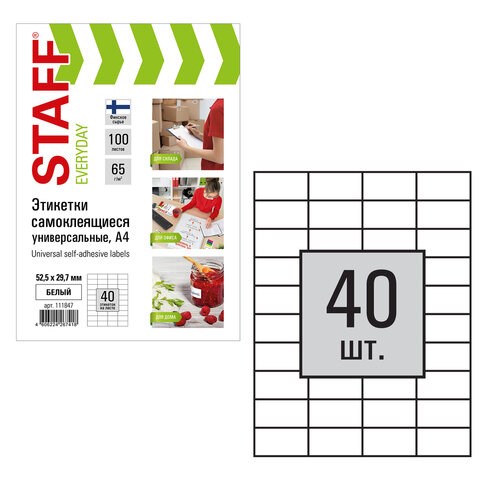 Этикетка самоклеящаяся 52,5х29,7 мм, 40 этикеток 65 г/м2, 100 л., STAFF "EVERYDAY" (сырье Финляндия), 111847