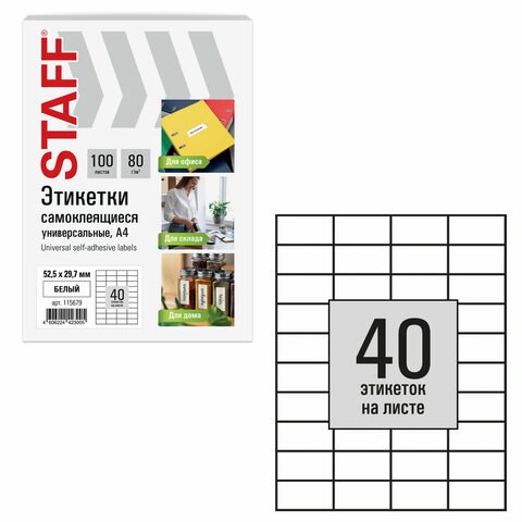 Этикетка самоклеящаяся 52,5х29,7 мм, 40 этикеток, белая, 80 г/м2, 100 листов, STAFF BASIC, 115679