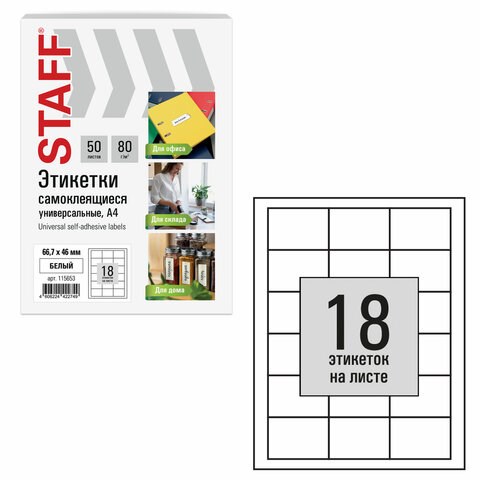 Этикетка самоклеящаяся 66,7х46 мм, 18 этикеток, белая, 80 г/м2, 50 листов, STAFF BASIC, 115653