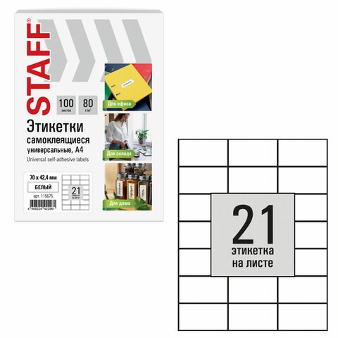 Этикетка самоклеящаяся 70х42,4 мм, 21 этикетка, белая, 80 г/м2, 100 листов, STAFF BASIC, 115675