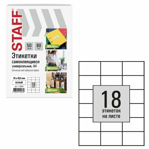 Этикетка самоклеящаяся 70х49,5 мм, 18 этикеток, белая, 80 г/м2, 50 листов, STAFF BASIC, 115654