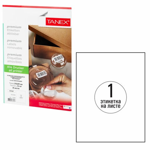 Этикетка самоклеящаяся УДАЛЯЕМАЯ 210х297 мм, 1 этикетка, белая, 70 г/м2, 25 листов, TANEX, сырье Финляндия, 114546, TW-2000