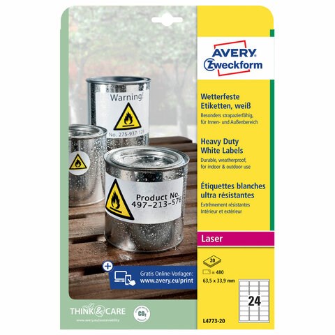 Этикетка самоклеящаяся ВСЕПОГОДНАЯ 63,5х33,9 мм, 24 этикетки, полиэстер, белая, 20 листов, Avery L4773-20