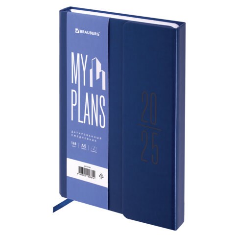 Ежедневник датированный 2025, А5, 138x213 мм, BRAUBERG "Towny", под кожу, клапан, синий, 115765