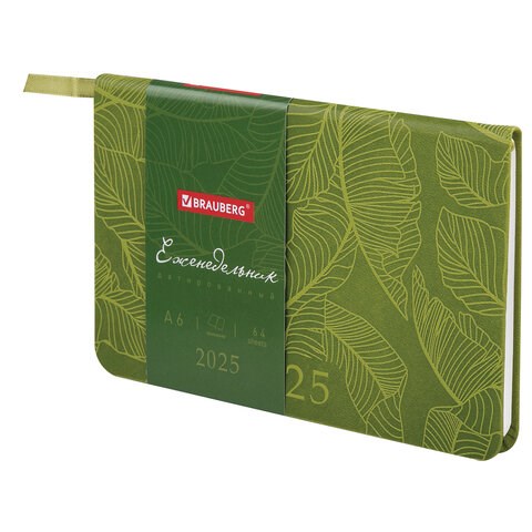 Еженедельник датированный 2025 МАЛЫЙ ФОРМАТ 95х155 мм А6, BRAUBERG "Foliage", под кожу, зеленый, 115988