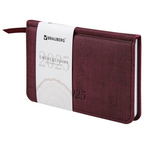 Еженедельник датированный 2025 МАЛЫЙ ФОРМАТ 95х155 мм А6, BRAUBERG "Wood", под кожу, бордовый, 115986