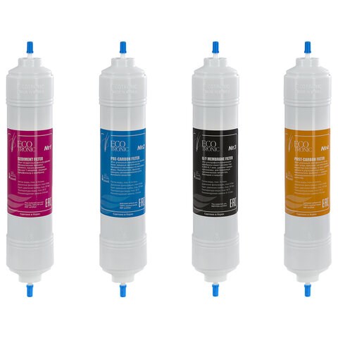Фильтры для пурифайера ECOTRONIC обеспечивают четырёхступенчатую ультрафильтрацию воды. Они удаляют механические примеси, хлор, хлорорганические соединения, вирусы, микробы и другие загрязнения.