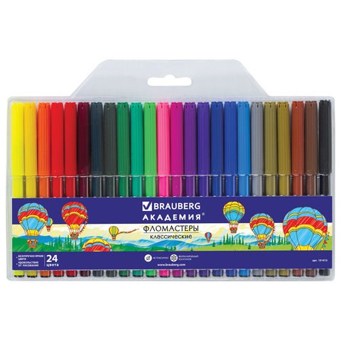 Фломастеры BRAUBERG "АКАДЕМИЯ", 24 цвета, вентилируемый колпачок, ПВХ упаковка, 151413