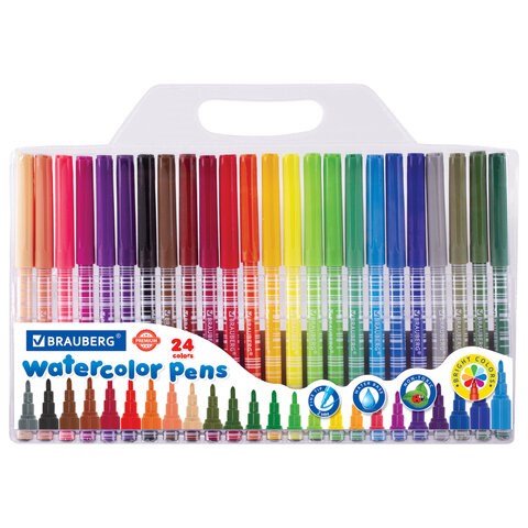 Набор фломастеров BRAUBERG "PREMIUM" с насыщенными, яркими цветами в количестве 24 штук. Чернила на водной основе практически не имеют запаха, не токсичны и легко смываются с большинства материалов и тканей.