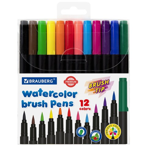 Фломастеры BRAUBERG PREMIUM - набор из 12 круглых фломастеров с наконечником-кистью, смываемыми чернилами на водной основе в ПВХ-упаковке для рисования.