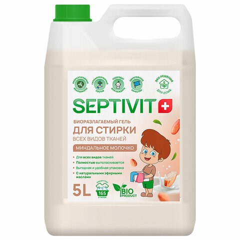Гель SEPTIVIT "Миндальное молочко" для ручной и машинной стирки изделий из различных видов тканей. Экологичный, гипоаллергенный состав подходит для людей с чувствительной кожей – средство полностью вымывается из волокон ткани.