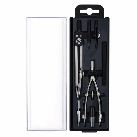 Готовальня предназначена для учеников средних и страших классов. В комплект готовальни входят 7 предметов: циркуль стальной никелированный, пенал с запасным грифелем, кронциркуль, карандашная вставка, игольная вставка, ручка, рейсфедерная вставка.