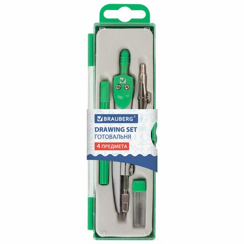 Готовальня BRAUBERG "Klasse", 4 предмета: циркуль 125 мм, рейсфедерная вставка + держатель, грифель, 210334
