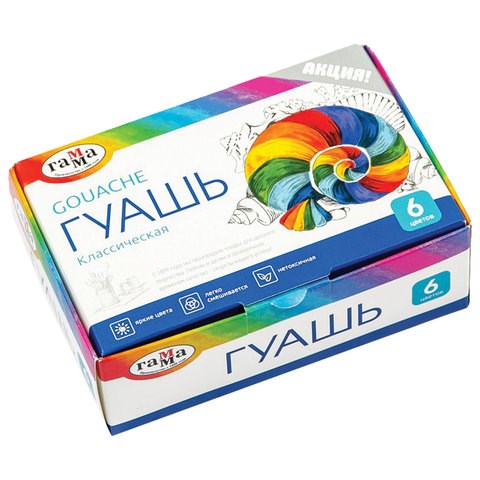 Гуашь ГАММА "Классическая", 6 цветов по 20 мл, без кисти, картонная упаковка, 2210306