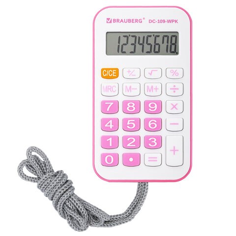 Калькулятор карманный со шнурком BRAUBERG DC-109-WPK (61x110 мм), 8 разрядов, БЕЛЫЙ/РОЗОВЫЙ, 272646