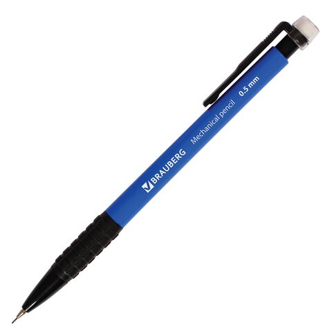 Механический карандаш BRAUBERG "Comfort" с корпусом синего цвета и и удобным резиновым упором, исключающим скольжение пальцев во время письма.