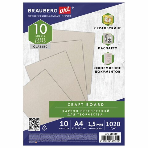 Картон переплетный, толщина 1,5 мм, А4 (210х297 мм), КОМПЛЕКТ 10 шт., BRAUBERG ART, 115339