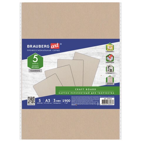 Картон переплетный, толщина 3 мм, А3 (297х420 мм), КОМПЛЕКТ 5 шт., BRAUBERG ART, 114212