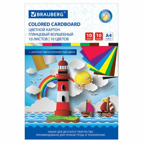 Картон цветной А4 МЕЛОВАННЫЙ (глянцевый), ВОЛШЕБНЫЙ, 10 листов 10 цветов, в папке, BRAUBERG, 200х290 мм, "Маяк", 129915