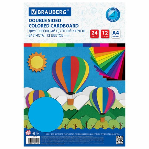Картон цветной А4 ТОНИРОВАННЫЙ В МАССЕ, 24 листа 12 цветов, 180 г/м2, BRAUBERG, 129309
