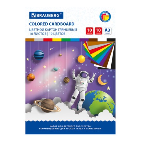 Картон цветной БОЛЬШОГО ФОРМАТА, А3, МЕЛОВАННЫЙ (глянцевый), 10 листов 10 цветов, BRAUBERG, 297х420 мм, "Галактика", 129908