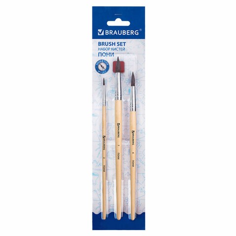 Кисти BRAUBERG, набор 3 шт. (пони, круглые № 2, 4, 7), блистер, 200220