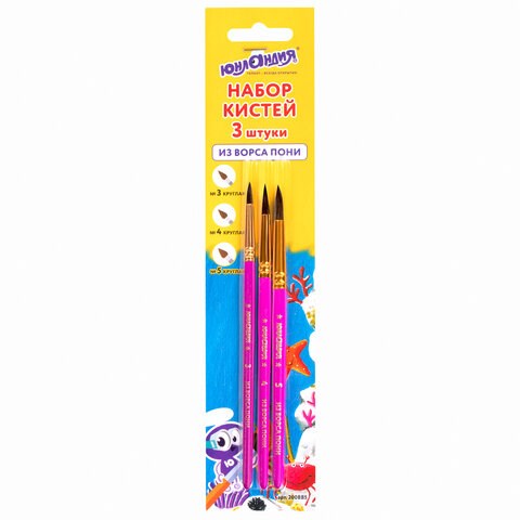 Кисти ЮНЛАНДИЯ, набор 3 шт. (ПОНИ: круглые № 3, 4, 5), блистер с европодвесом, 200885