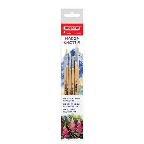 Кисти ПИФАГОР, набор 5 шт. (ПОНИ: круглые № 1, 4; КОЗА: круглые № 3, 6; ЩЕТИНА: плоская № 4), пакет с европодвесом, 200892