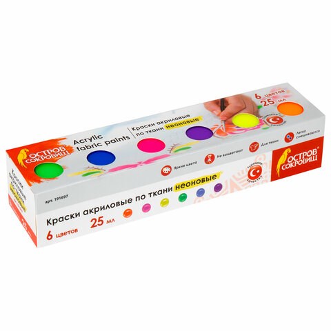 Краски акриловые по ткани НЕОН ОСТРОВ СОКРОВИЩ 6 цветов по 25 мл, 191697